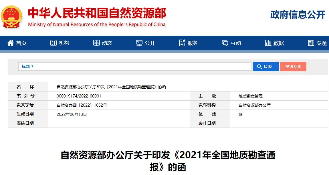 为加强信息交流,定期通报地质勘查成果和行业发展情况,根据有关要求,我部组织编制《2021年全国地质勘查通报》。现予印发,供参考。 自然资源部办公厅 2022年6月13日附件 : 2021年全国地质勘查通报.docx PDF版下载